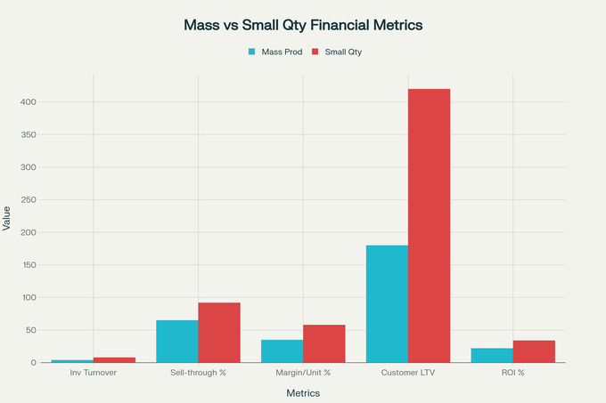 Unit cost premiums associated with small quantity sourcing can be substantial compared to large-volume production, but these higher costs must be evaluated against the reduced inventory risk, faster inventory turnover, and higher sell-through rates that small quantity strategies typically achieve. The overall financial impact often favors small quantity approaches despite higher production costs.